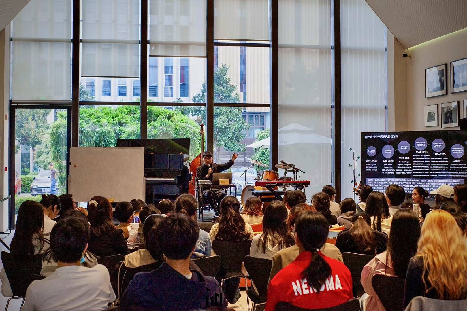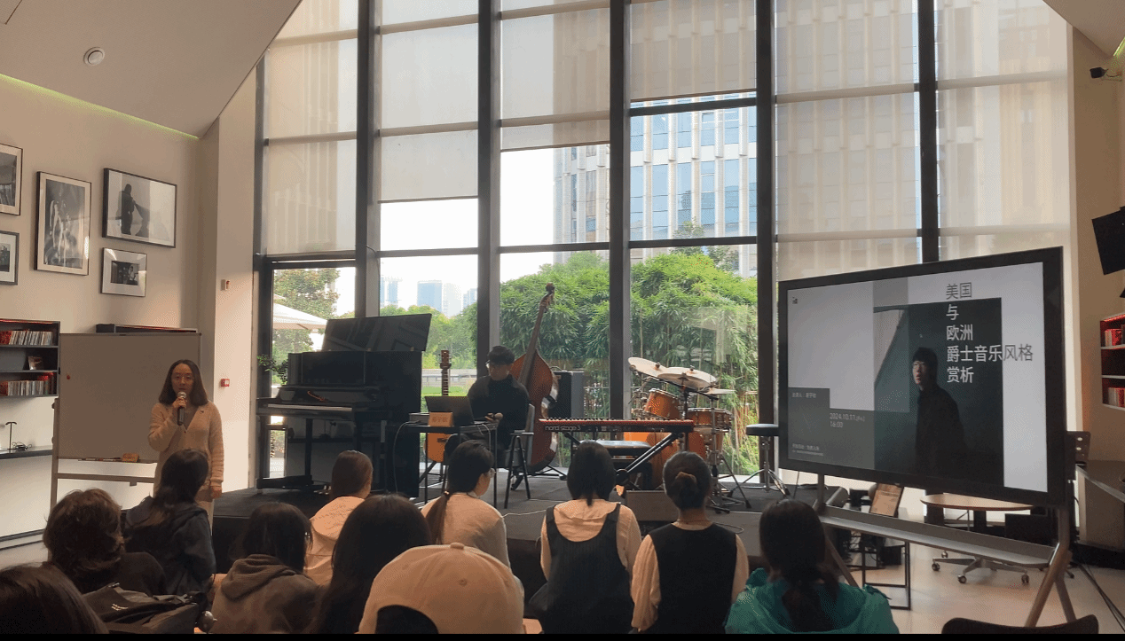 讲座开始,主持人潘艺老师简要说明了讲座的缘起并介绍了主讲人易宇钦。易宇钦首先为大家解读了讲座的题目,提醒大家在听具体的音乐作品时要更立体细致地聆听和分析音乐的风格;接着他为大家介绍了爵士乐发展的历史脉络,在这个过程中他也用具体的爵士乐作品让我们对每个历史阶段的风格有更清晰直观的了解;然后他通过分析一些欧洲爵士乐作品与美国爵士乐作品中的音乐元素与节奏律动等,让大家对这两种风格的区别有了直观的感受。同时在讲座进行过程中,他也多次跟听众互动,让听众可以随时提问,并根据大家的问题用具体的音乐作品或他在钢琴上的演奏来辅助呈现他的想法与解答。通过此次聆听沙龙讲座,大家不仅了解了爵士乐的发展历程以及聆听爵士乐的具体方法,同时也锻炼了大家欣赏音乐的能力与思维,提高了对音乐艺术的审美。此外,当天晚上易宇钦还与1701的常驻爵士乐手们一起为观众奉献了精彩的四重奏演出,包含他的几首原创作品以及爵士乐标准曲。