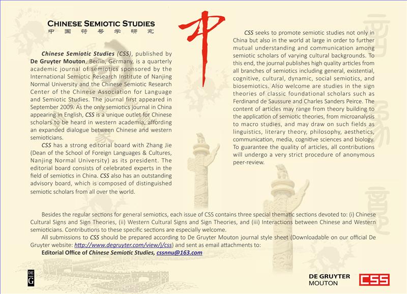 《中国符号学研究》旨在促进中国乃至全世界的符号学研究,加深不同文化背景下的符号学学者之间的理解和交流,为此,本刊出版论文话题涵盖一般符号学、存在符号学、认知符号学、文化符号学、动态符号学、社会符号学、生物符号学等等。既有对索绪尔符号学理论的研究,也有对皮尔士符号学思想的探讨;既有总体理论框架的构建,又兼顾各个符号学分支的建立;既有理论研究,又不乏理论应用;既从微观角度分析,又有宏观方面的研究;学科跨越语言学、文学、艺术、美学、哲学等。为确保论文质量,本刊对所有投稿的文章进行匿名评审。