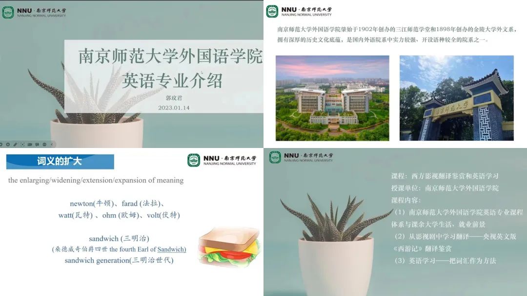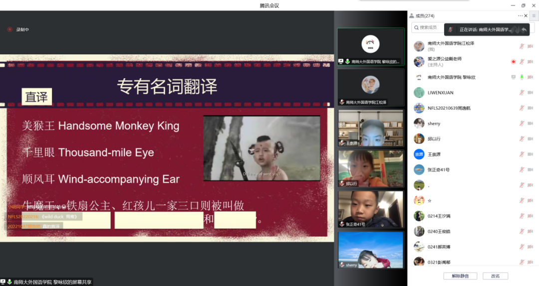 志愿团队已面向南京市中华中学开始了三期、四讲网络直播课程,课程围绕四大名著、儒林外史、颜氏家训等古典文学经典,带领青少年群体从英语视角解读文学作品,单场在线人数超600人,受到学生和家长的一致好评。