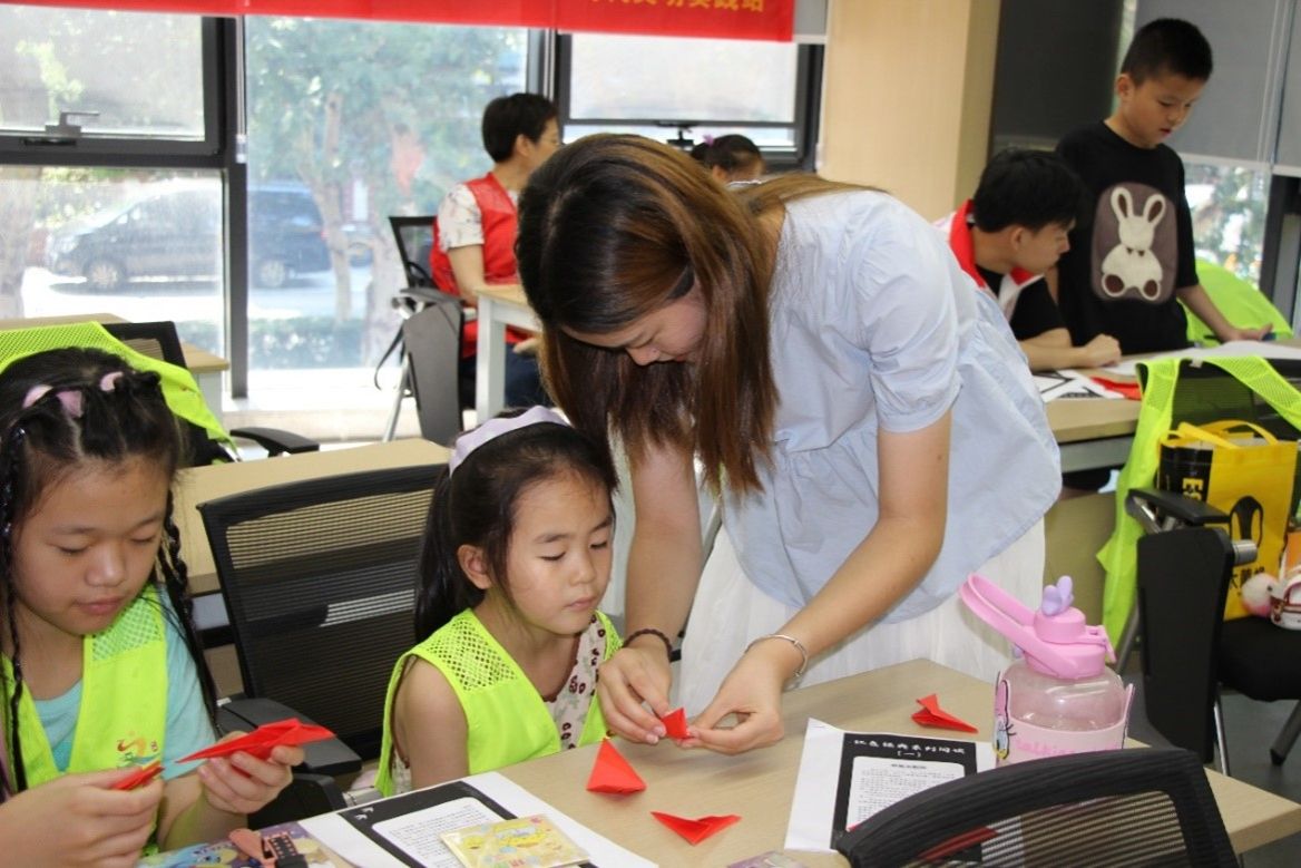 传承红色基因,赓续红色血脉。团队于7月先后在江苏省南京市世茂滨江社区、莲花嘉园社区、来凤街社区、扬州市江都区乐和社区、安徽省亳州市谯城区大杨镇丁固小学开展“童心向党 寻梦中华”主题课程。基于《中华人民共和国爱国主义教育法》,实践团成员带领孩子们学思想、学法律、学标准、阅信件,读《红色小歌仙》的故事,并带领孩子们进行“红色五角星”特色折纸活动,联合社区开展“讲好爱国故事,凝聚爱国力量”红色故事分享会活动。