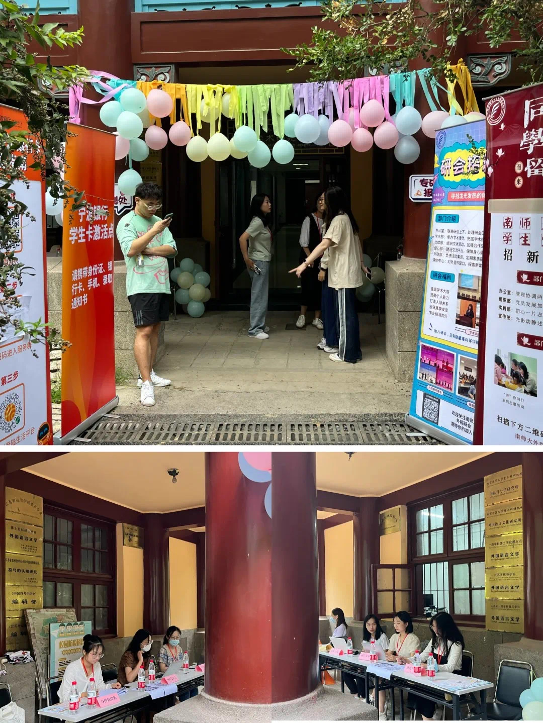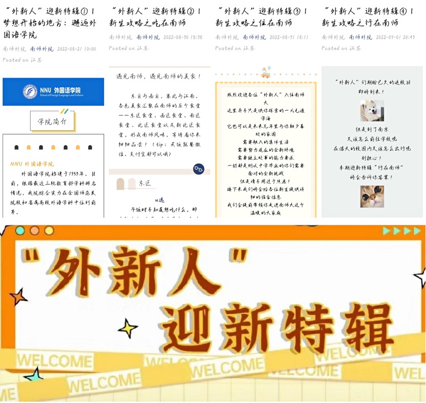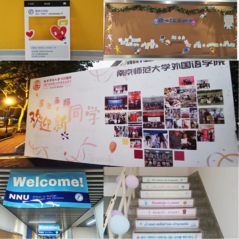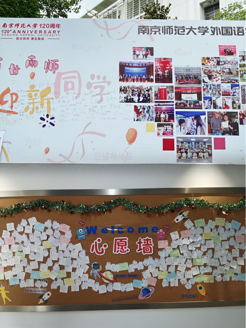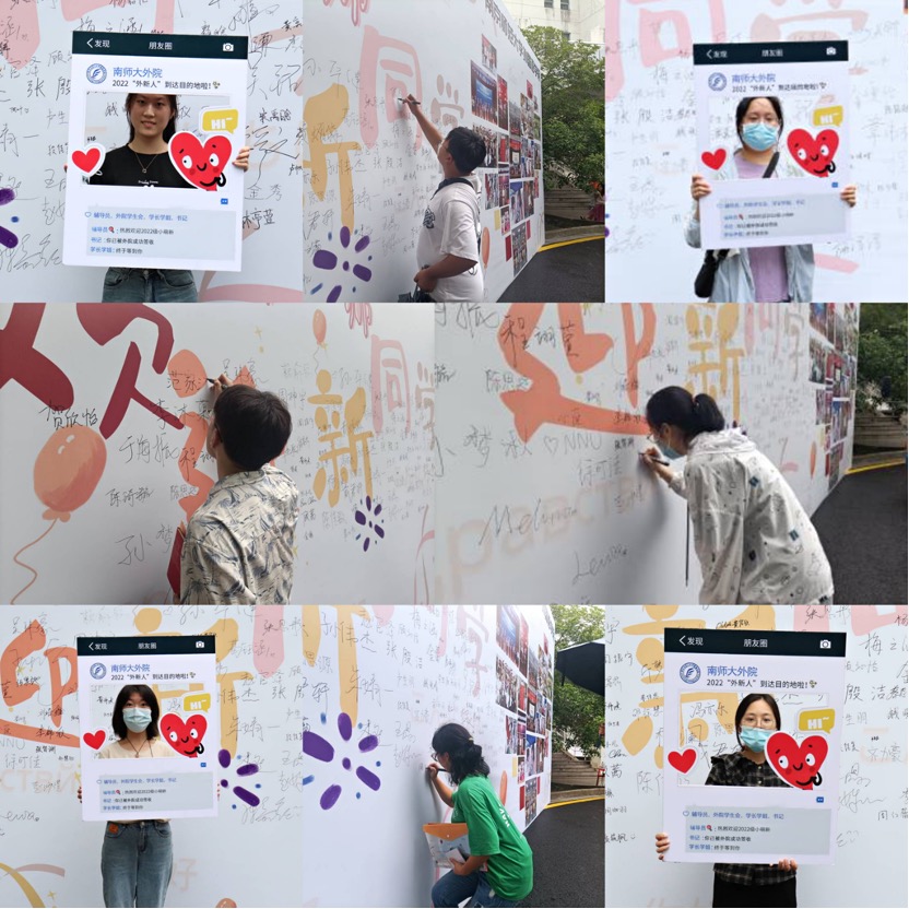 为展现外院多元氛围和文化特色,学院精心布置了两个校区的重点区域,设置喷绘、签名墙、心愿墙等“打卡地”,静候外“新”人探索。与此同时,关于南师食、住、行的系列推送也早已与新同学们见面。