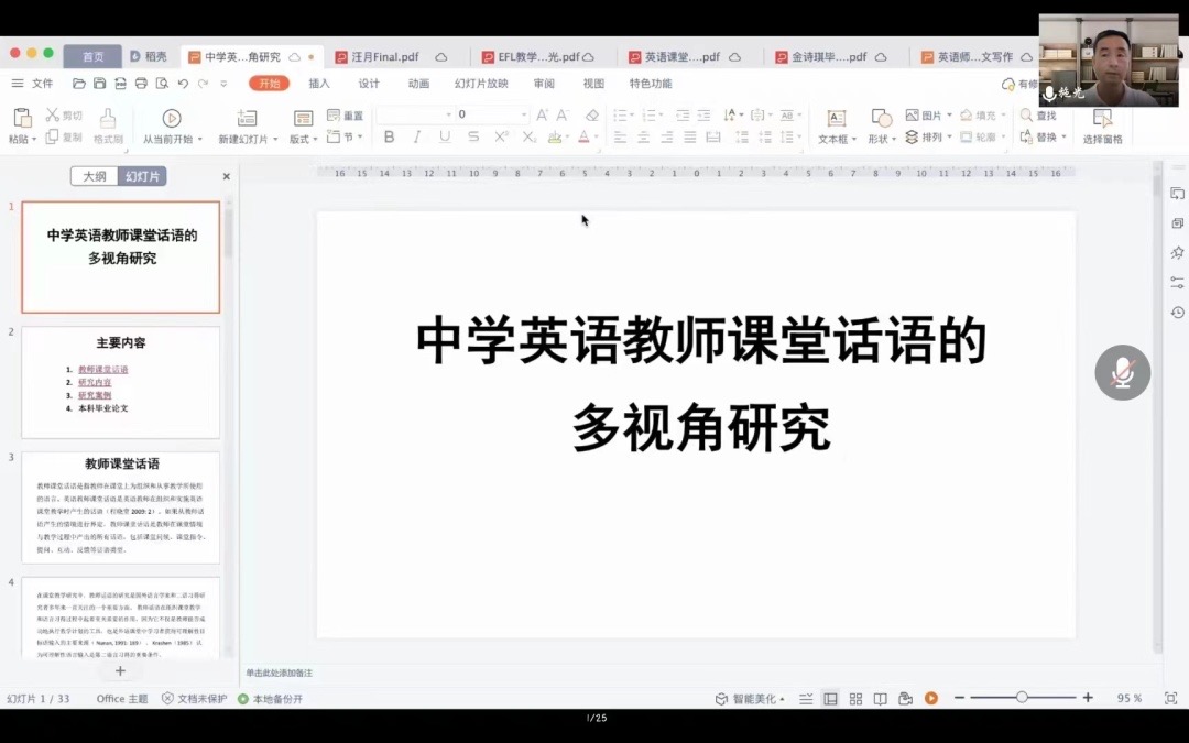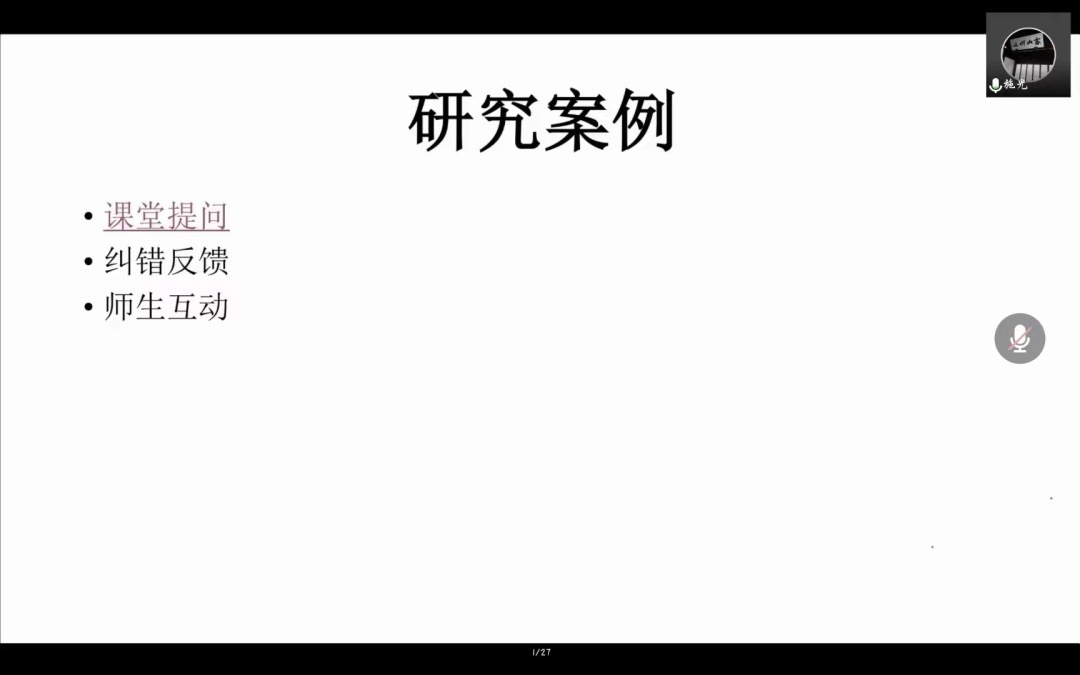 施老师依托学生本科毕业论文、硕士毕业论文等,结合具体研究案例,深入探讨初高中英语实习教师课堂话语研究,涵盖英语教师提问信念与行为一致性研究、英语课堂中的教师纠错与学生接纳、高中英语阅读课堂师生互动言语行为研究等主题,多维度、多层次地围绕讲座主题进行深入探讨。